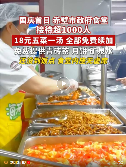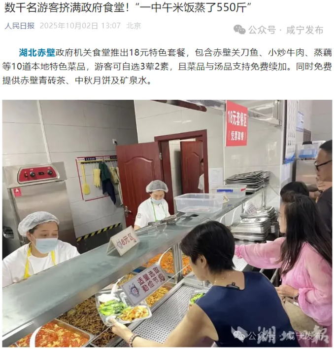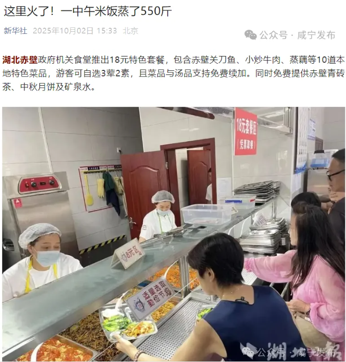 10月2日新華社、人民日報相繼報道赤壁市在國慶中秋節期間開放政府機關食堂推出18元特色套餐包含赤壁關刀魚、小炒牛肉、蒸藕等10道本地特色菜品為游客提供貼心服務成了節日期間一道美麗的風景線
