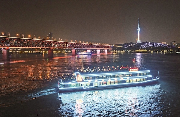 國慶期間,武漢兩江四岸燈火璀璨,夜色盡顯壯美。入夜,江城十余艘游船穿梭江面,滿載八方賓客開啟長江夜游之旅。游客沐浴江風,欣賞流光溢彩的燈光與城市地標交相輝映的景致,沉浸式感受江城夜晚的獨特魅力。