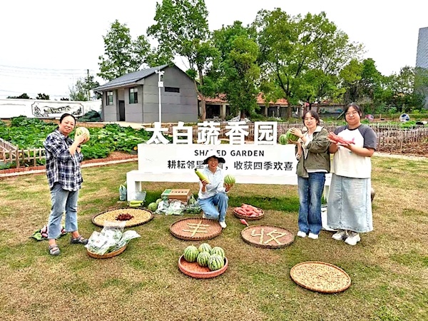 太白湖生態(tài)農(nóng)園工作人員和共享菜園認(rèn)養(yǎng)人展示收成 攝影:楚天都市報(bào)極目新聞?dòng)浾咄踉F