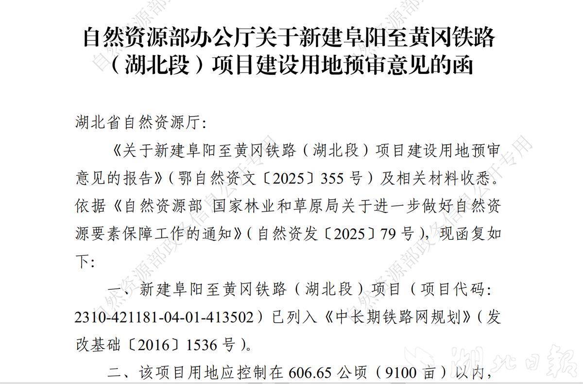 湖北日報訊(記者胡祎)9月30日,自然資源部辦公廳印發《關于新建阜陽至黃岡鐵路(湖北段)項目建設用地預審意見的函》(自然資辦函〔2025〕2263號),京港高鐵阜陽至黃岡(湖北)段建設用地預審意見正式獲自然資源部批復,為項目可研批復和全面開工建設奠定了基礎。