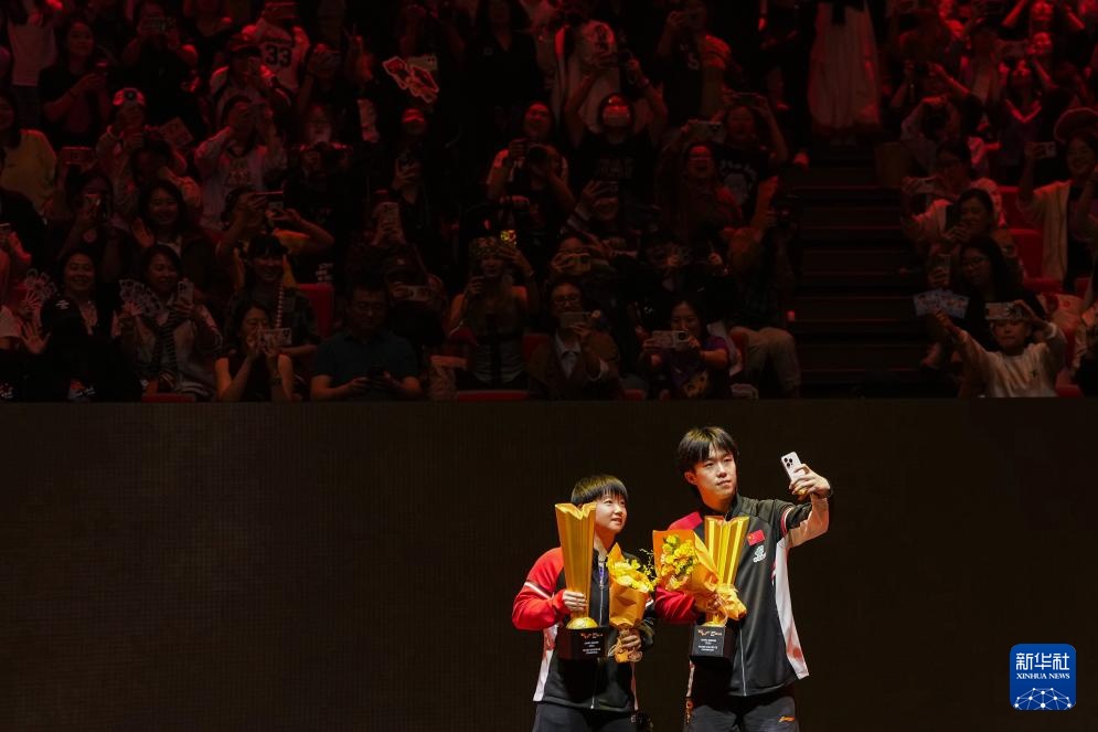 10月3日,冠軍中國組合王楚欽(右)/孫穎莎在頒獎儀式上自拍。
