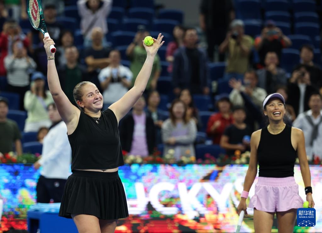 10月3日,謝淑薇/奧斯塔彭科(左)在比賽后與觀眾互動。