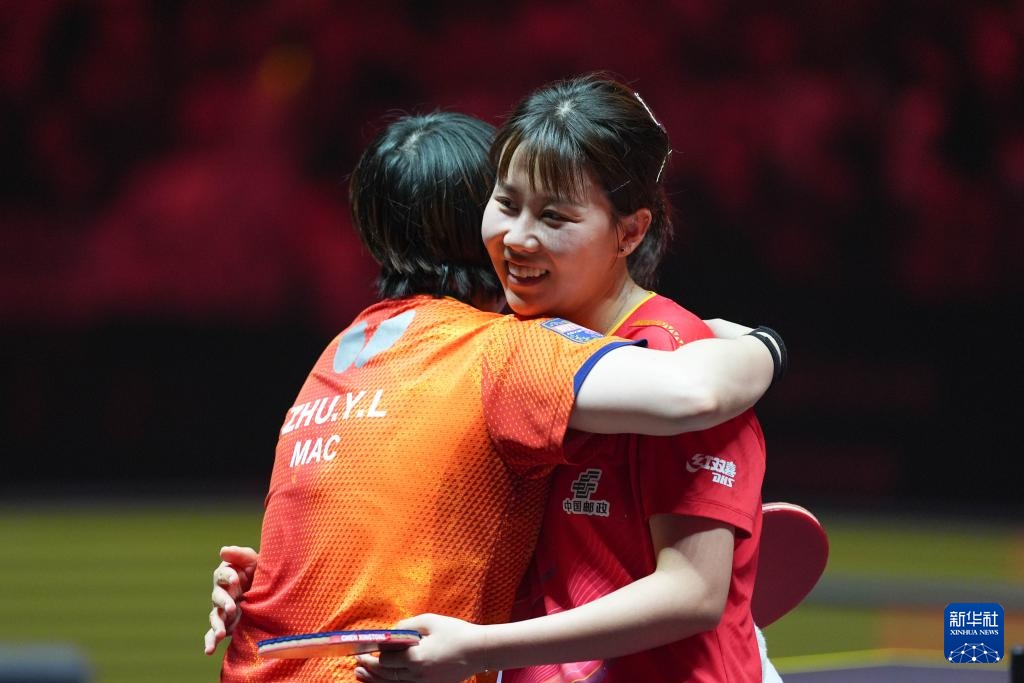 10月3日,陳幸同(右)與朱雨玲在賽后擁抱。