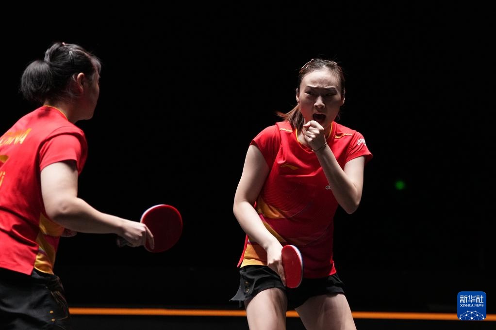 10月3日,早田希娜(左)/朱芊曦在比賽中慶祝得分。