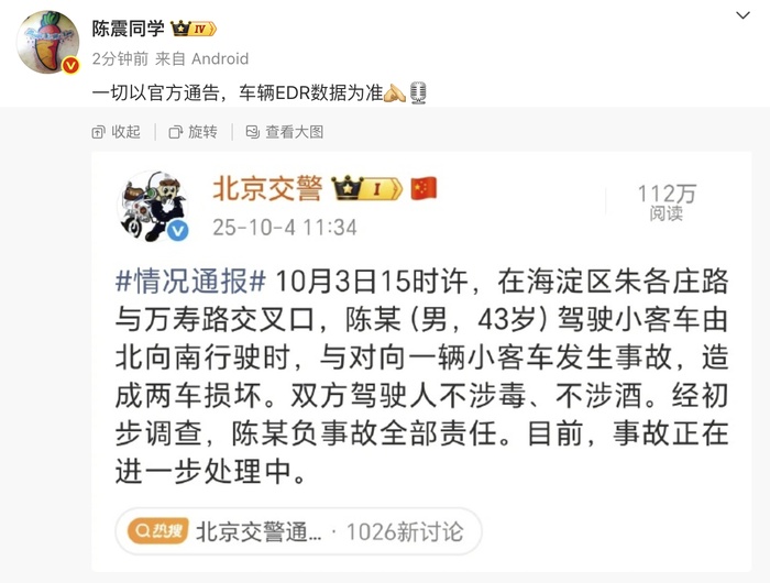 據(jù)此前報(bào)道,10月3日下午,有網(wǎng)友曝出圖片,稱知名車評(píng)人陳震發(fā)生交通事故。事發(fā)地轄區(qū)交警回應(yīng)媒體稱,相關(guān)路段確實(shí)發(fā)生了事故,目前事故正在處理當(dāng)中。