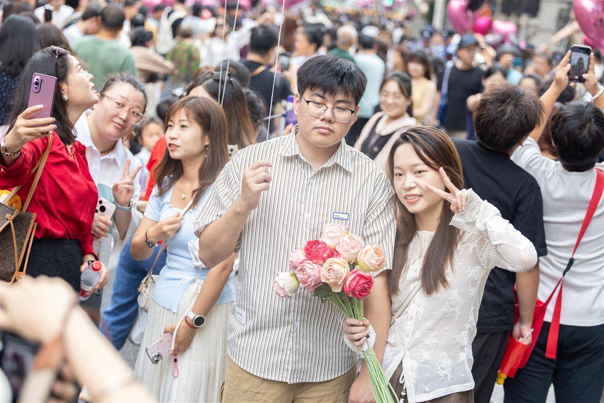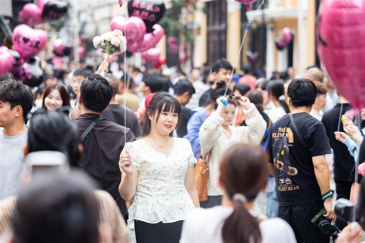 2025年10月4日,“十一”小長假第四日,在武漢市江岸區漢口歷史風貌區,大批游客手持氣球、鮮花在巴公房子拍照打卡。巴公房子經過修繕與保護如今成為外地游客來武漢游玩的必去景點。(湖北日報全媒記者 何宇欣 攝)
