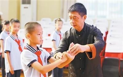 四川樂山市文化館利用地方文化資源,邀請國家級非物質文化遺產峨眉武術代表性傳承人王超給學生講解動作要領。