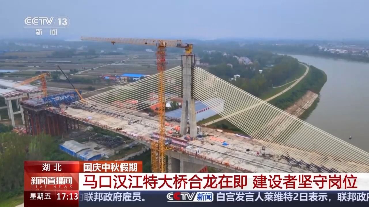 在湖北漢川,武天高速馬口漢江特大橋已展露雄姿,預計11月合龍,全橋貫通。這個國慶假期,200多名建設者正奮戰在施工一線,全力保障項目建設進度。