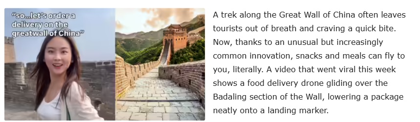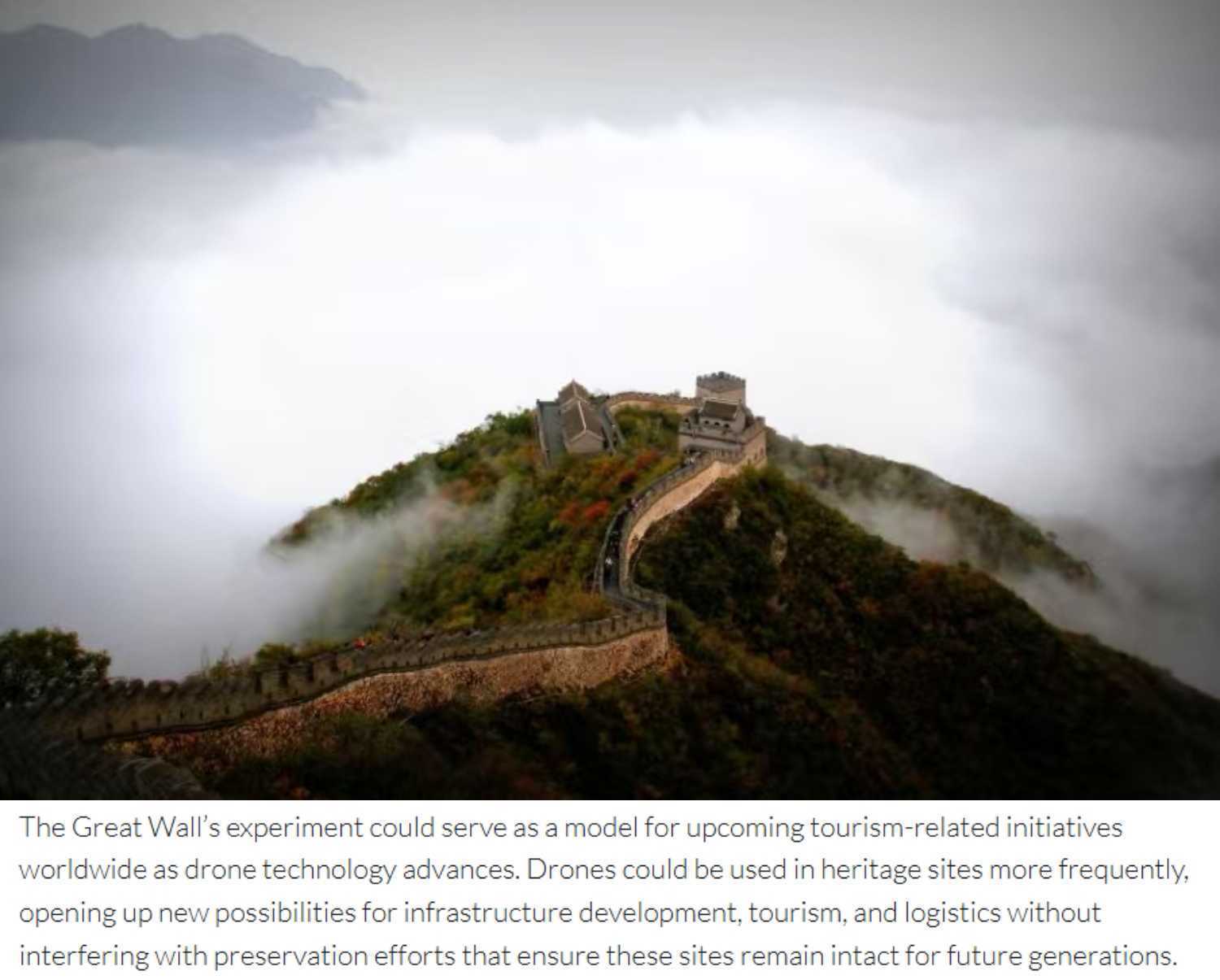 美國《旅行和旅游世界》網(wǎng)站報(bào)道認(rèn)為,中國已成為無人機(jī)技術(shù)開發(fā)與應(yīng)用的全球引領(lǐng)者,政府正積極推動無人機(jī)在物流、旅游和應(yīng)急服務(wù)等領(lǐng)域的應(yīng)用。在長城這類標(biāo)志性景區(qū)的實(shí)踐,進(jìn)一步彰顯了中國將科技深度融入人文景觀的決心。隨著無人機(jī)物流網(wǎng)絡(luò)的持續(xù)擴(kuò)展,其必將在中國乃至全球旅游業(yè)未來發(fā)展中扮演關(guān)鍵角色。無論是運(yùn)送餐食、醫(yī)療物資還是應(yīng)急救援物資,這項(xiàng)技術(shù)正在重塑運(yùn)輸模式,特別是在傳統(tǒng)運(yùn)輸難以覆蓋的區(qū)域。