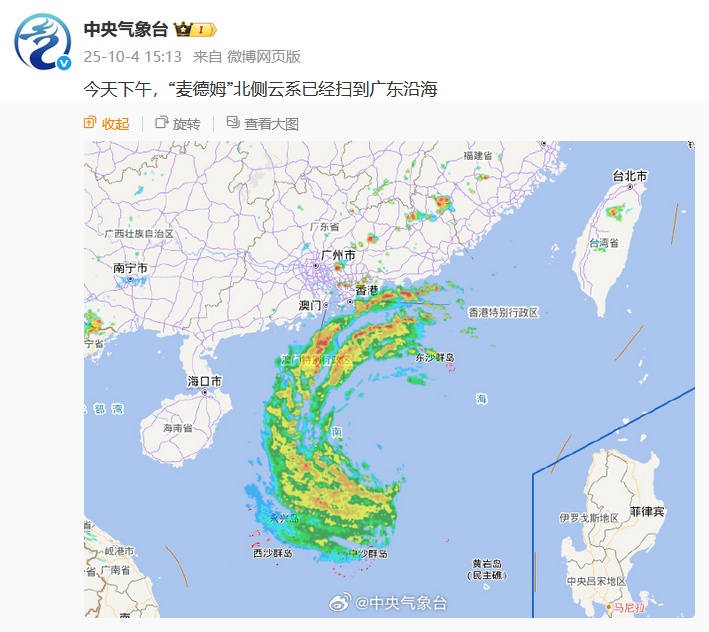 據@中央氣象臺10月4日消息,“麥德姆”北側云系已經掃到廣東沿海。