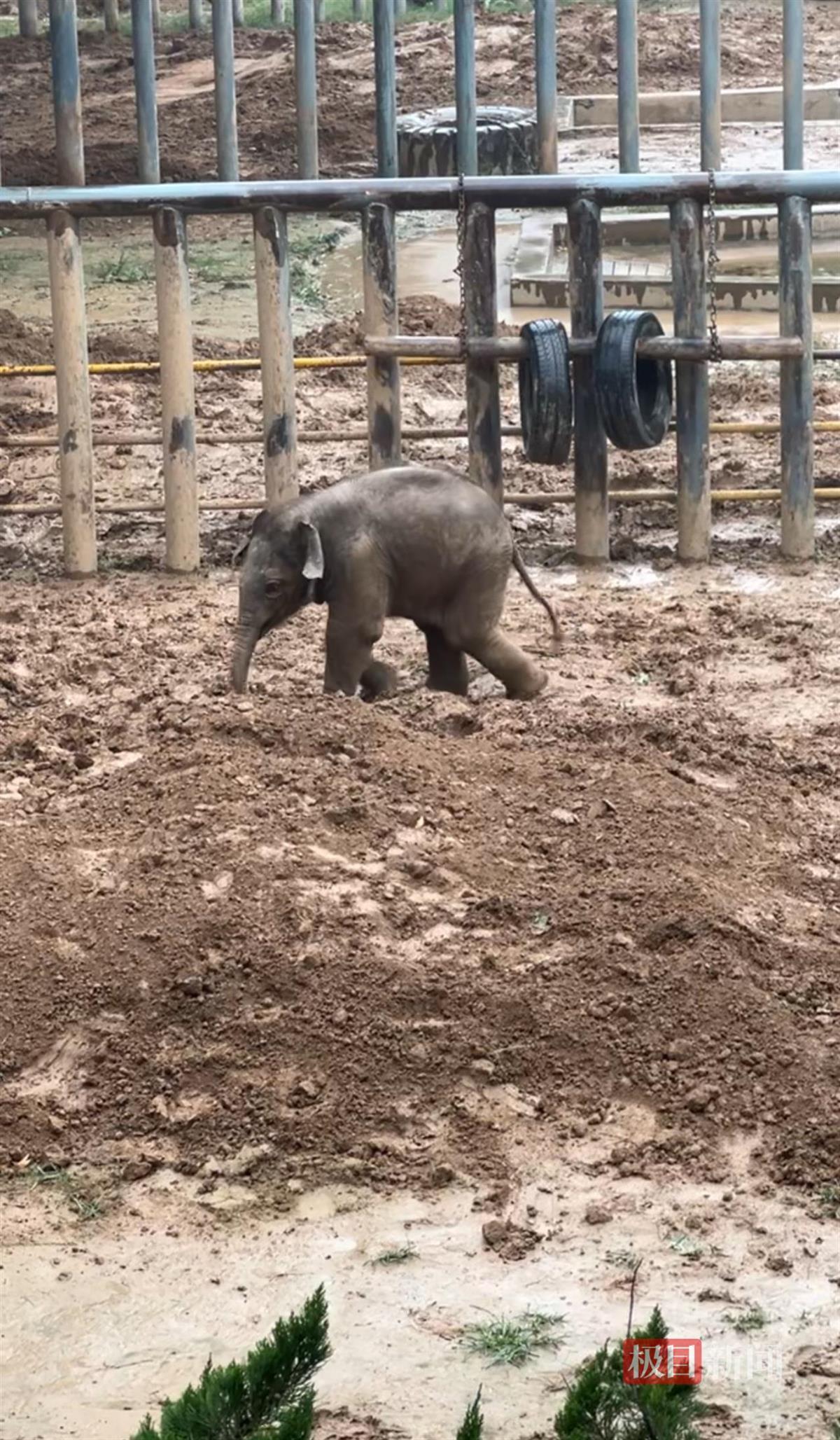 下午1時45分左右,小象和媽媽提前走出象舍。小象一出場,熱烈的歡呼聲不斷,大家舉起手機拍照,不愿意錯過任何瞬間。這只“兩三百斤的寶寶”活力四射,甩動象鼻子滿場奔跑,時而玩玩輪胎玩具,時而在泥水坑里踩水,“營業”熱情滿滿。記者還注意到,經過前幾天被絆倒的圓木玩具時,它的一舉一動顯得小心翼翼,生怕再次摔倒。