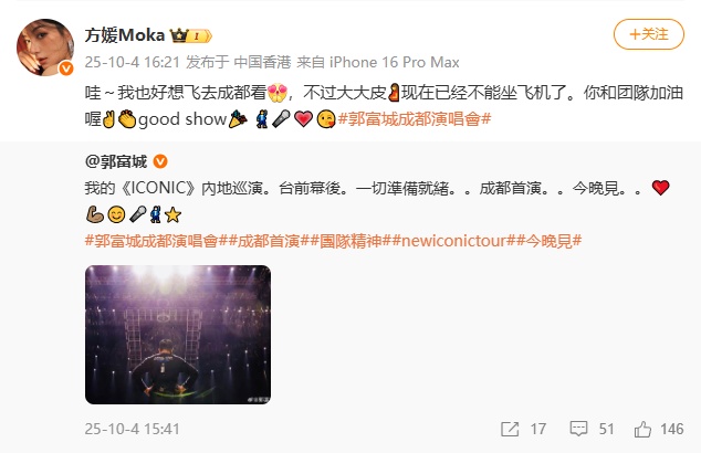 10月4日,方媛轉發郭富城的微博內容稱:“哇,我也好想飛去成都看,不過大大皮(上海話的大肚皮)現在已經不能坐飛機了。你和團隊加油喔,good show。”