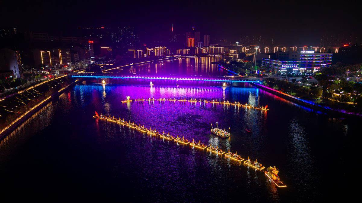 10月3日,黃岡市英山縣溫泉鎮一河兩岸“夜游英山”景區燈光璀璨,吸引了大量市民和游客前來觀賞,盡享美好假期時光。(視界網 王江 攝)