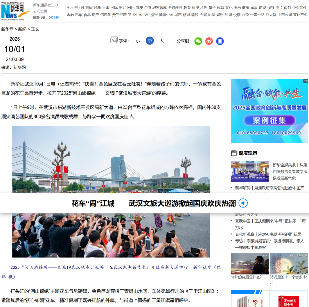 10月1日上午,由武漢市人民政府、湖北省文化和旅游廳主辦,武漢市文化和旅游局、武漢東湖新技術開發區、湖北廣播電視臺承辦的2025“河山添錦繡”武漢文旅IP城市大巡游活動,在武漢高新大道盛大舉行。
