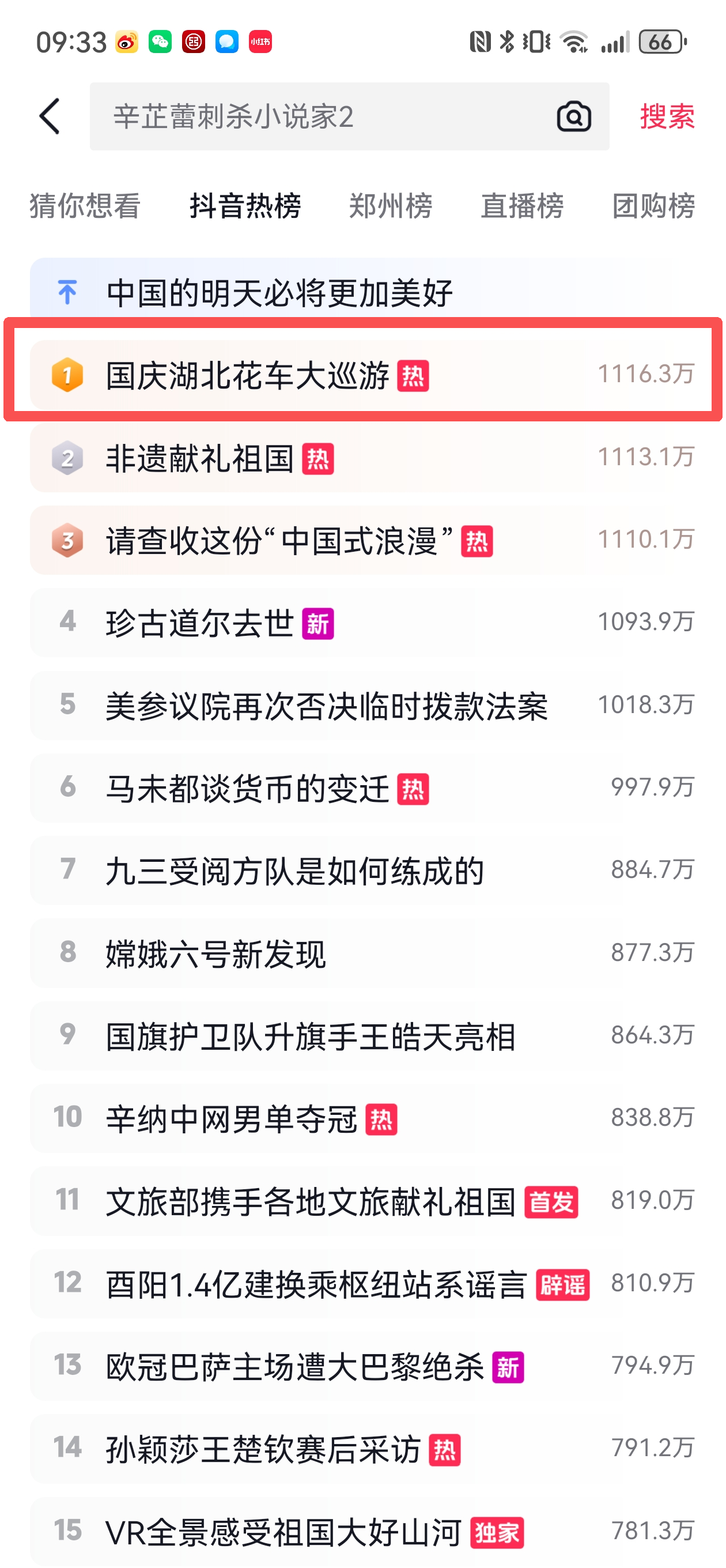 此外,抖音話題#國慶湖北花車大巡游#閱讀量超4261萬,占據抖音熱搜全國總榜第一位超過24小時,#國慶湖北花車大巡游后續來了#、#香港駐漢辦主任點贊湖北花車巡游#等相關話題持續占據抖音武漢熱榜前五。