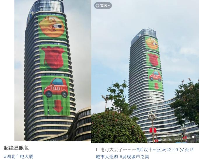 活動還沒開始,就先吸引了一波流量。活動前連續三天,湖北廣電傳媒大廈外立面陸續推出“讓我看看”“玫瑰”“汽車”三張巨幅表情海報,配合《快看,光谷東出現了巨型表情包!》等懸念式推文,吊足了網友的好奇心:“這不是‘看花車’嘛”“湖北文旅會玩、懂年輕人!”微博相關話題#武漢光谷東第一高樓出現巨型表情包#登上武漢熱榜。