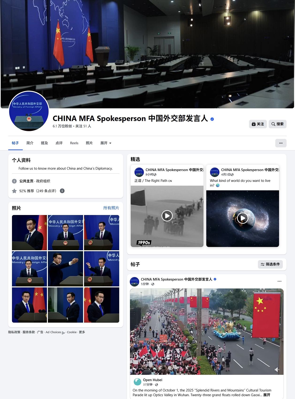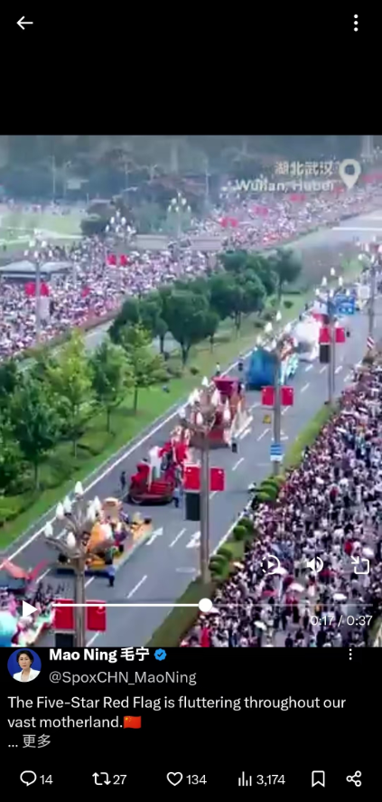 中國外交部官方頭部賬號“中國外交部發言人”、外交部新聞司司長毛寧賬號,均多次向全球發布花車巡游的盛大場景。“官方天團”集體推介,巡游活動全球傳播。