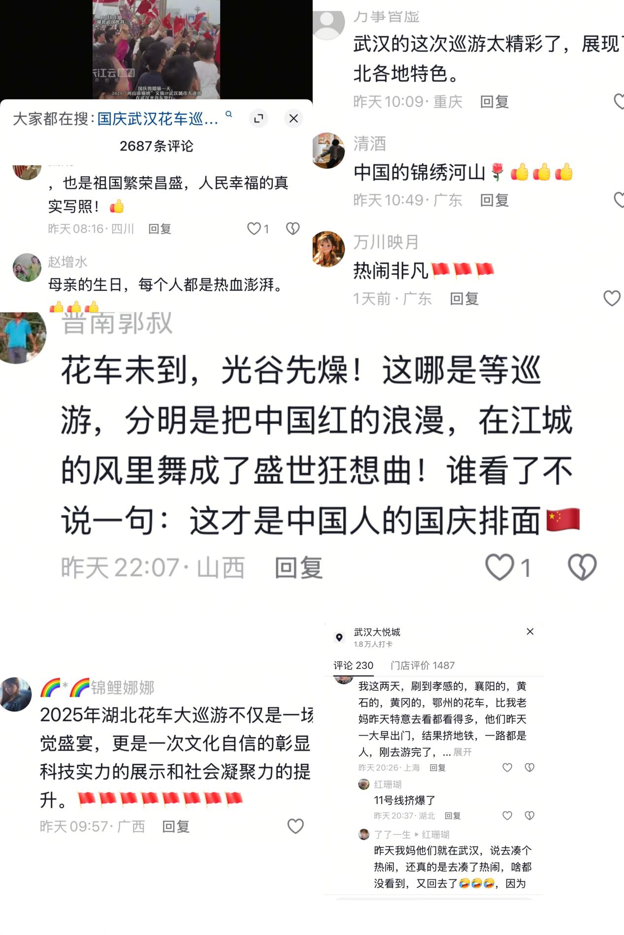 網友紛紛發帖感嘆“今天的光谷感覺來了一億人”“今天的武漢比過年還熱鬧!”“武漢知道自己火出圈了嗎?”還有不少網友詢問“活動還要辦幾天?”“后面還有機會看到花車嗎?”……