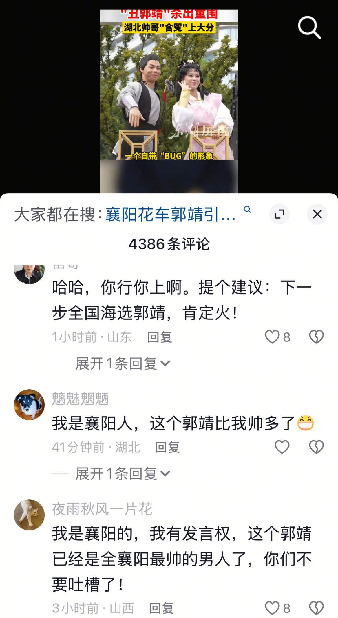 巡游還沒結束,抖音爆款不斷。“國慶湖北花車大巡游 扛起女友讓她看個夠”“穿尿不濕 騎肩膀 坐懷里 武漢小奶娃們看花車巡游萌翻全場”等短視頻瞬間刷爆!其中,關于襄陽花車“郭靖”扮演者“丑出圈”的話題迅速沖上熱搜,引發網友集體“炸鍋”。