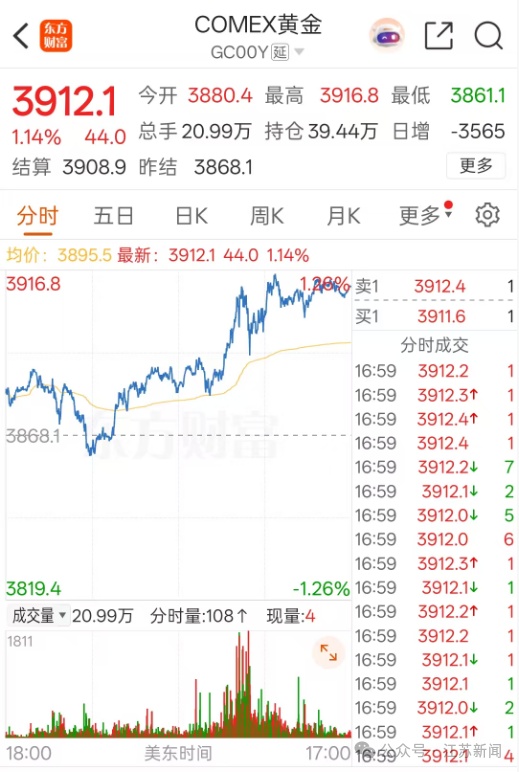 財聯社10月4日消息,COMEX黃金期貨收漲1.14%,報3912.1美元/盎司,本周累計上漲3.23%;COMEX白銀期貨收漲3.45%,報47.97美元/盎司,本周累計上漲3.46%。
