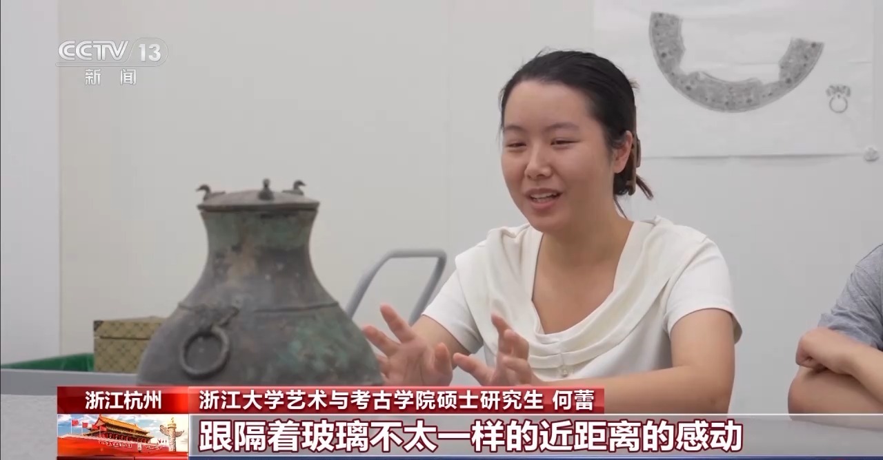 浙江大學藝術與考古學院碩士研究生 何蕾:跟隔著玻璃不太一樣的近距離的感動,我像是握住了一根細繩,而繩的那一邊是我們幾千年前祖先的脈搏和心跳。當時進入這個專業的初心,也是為了讓更多的人像我一樣熱淚盈眶地去看文物,希望我以后能將這種感動帶給更多的人。
