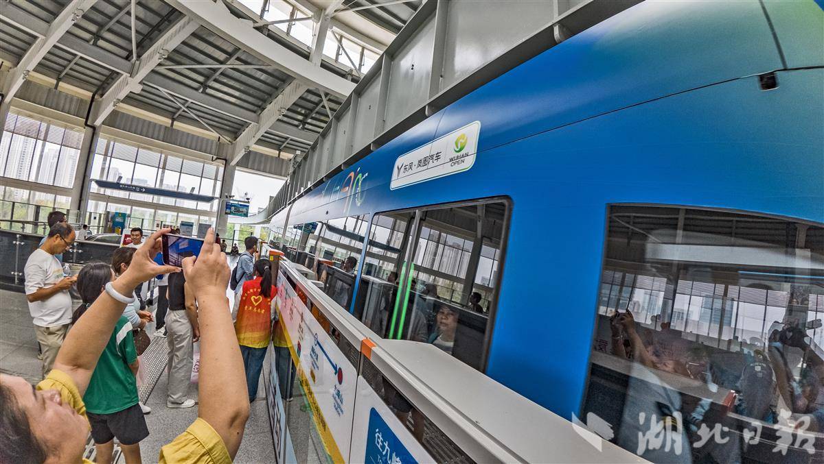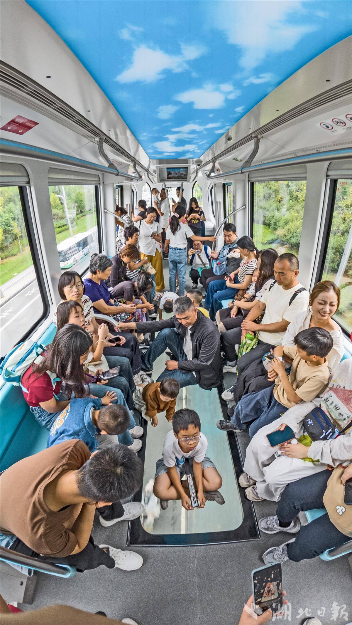 10月4日,武漢光谷空軌沿線站點人頭攢動,來自全國各地的游客專程前來體驗 “空中穿行” 的樂趣。在倒懸的 “光谷光子號” 車廂內,游客們或俯身透過透明地板觀察下方道路與綠植,或憑窗透過 270 度全景窗捕捉秋日里的生態景致,孩童的驚呼與家人的笑聲交織,現場氛圍熱鬧鮮活。(湖北日報全媒記者 劉曙松 攝)