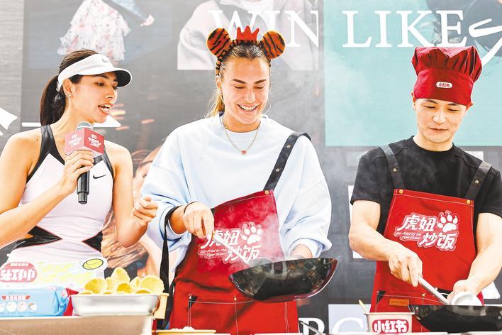 10月4日下午,武網“三冠王”薩巴倫卡掌勺顛鍋,為粉絲炒飯。 (湖北日報全媒記者 任勇 攝)
