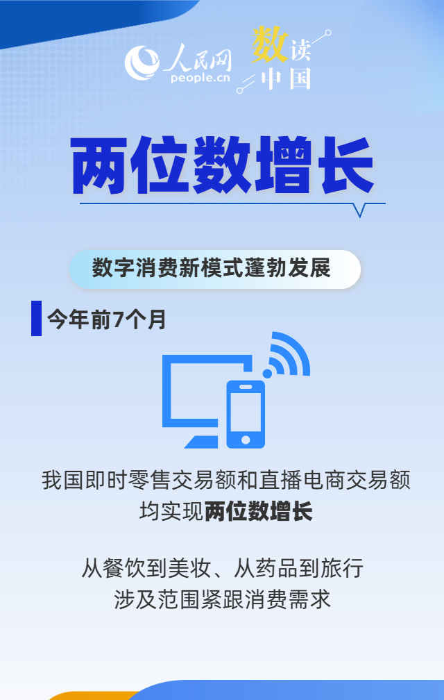 近日,商務部等8部門聯合印發《關于大力發展數字消費共創數字時代美好生活的指導意見》,要求擴大數字消費多元化供給。今年以來,以5G、人工智能為代表的數字基礎設施不斷完善,消費場景持續拓寬,帶動數字新消費蓬勃發展。我國發展數字消費潛力有多大?一組數據來看。