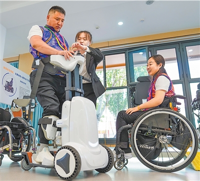 內蒙古呼和浩特市,一名殘疾人在站立機器人的輔助下直立。