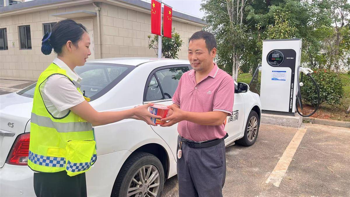 這是湖北交投江漢高速公路運營管理有限公司旗下,首批投入運營的15個高速服務驛站迎接的第一個重大節假日,也是烏林管理所轉型高速服務驛站后迎來的首個雙節假期,快速充電樁派上了大用場。當班工作人員小劉迅速引導車輛停到充電樁旁,熟練幫忙插上充電槍,趁著充電間隙,還端來礦泉水、泡面和月餅送給司乘朋友。