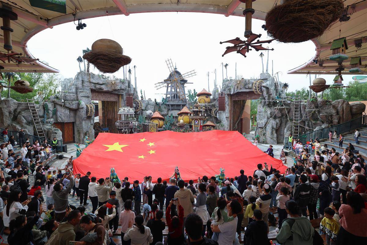游客在襄陽市華僑城奇幻度假區參加“我和國旗合影”快閃活動。
