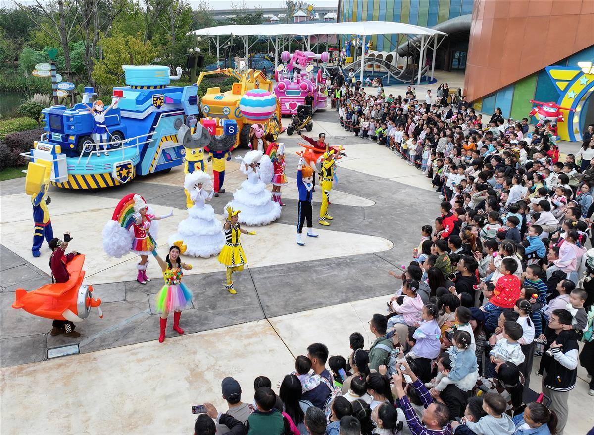 游客在襄陽市華僑城奇幻度假區觀看超級飛俠奇趣大巡游表演。
