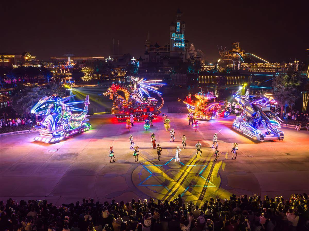游客在襄陽市華僑城奇幻度假區觀看奇幻夜光大巡游表演。