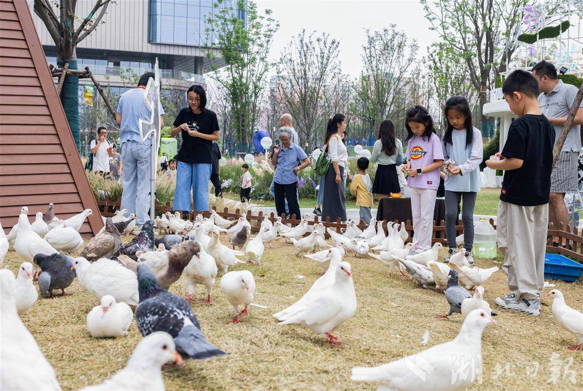 10月4日,游客在武昌濱江天街自帶的“曠野公園”內(nèi)投喂鴿子。