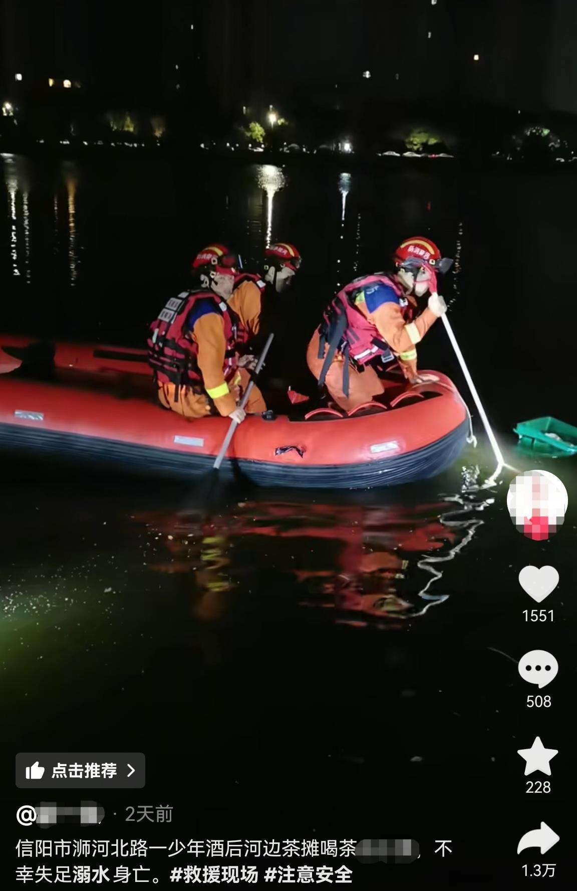 有網(wǎng)友日前發(fā)文稱,河南信陽市浉河北路一小伙2日晚在河邊茶攤喝茶,不幸失足溺水身亡。視頻顯示,在河邊一家茶座邊,多名消防人員正在用救生艇搜救,岸邊停有120急救車。