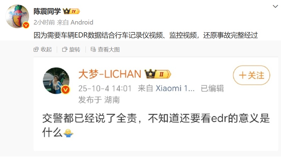 10月5日,知名車評人陳震回復網友為何要看車輛EDR數據:因為需要車輛EDR數據結合行車記錄儀視頻、監控視頻,還原事故完整經過。