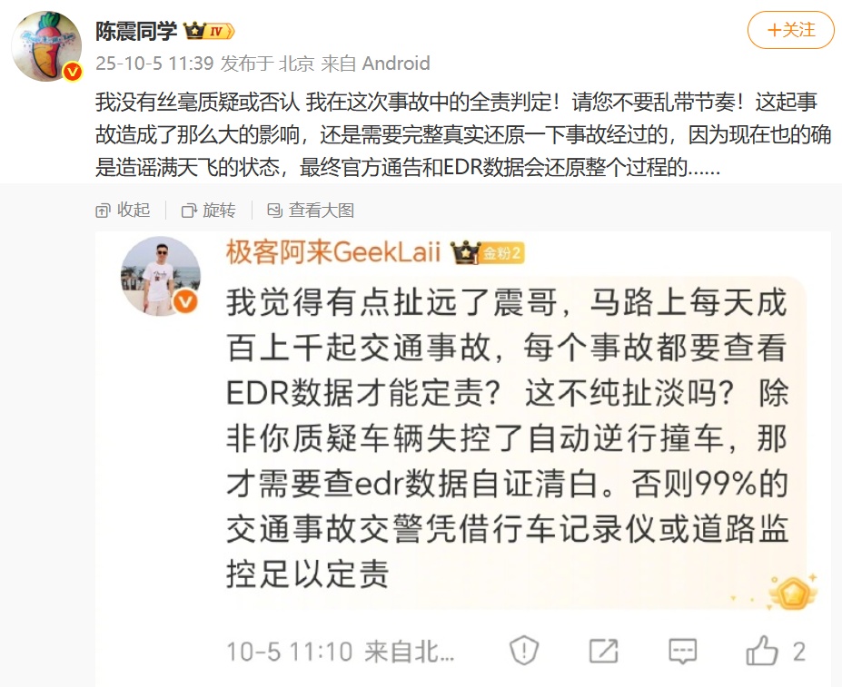 隨后,陳震再就看EDR數據進行回應:我沒有絲毫質疑或否認,我在這次事故中的全責判定!請您不要亂帶節奏!這起事故造成了那么大的影響,還是需要完整真實還原一下事故經過的,因為現在也的確是造謠滿天飛的狀態,最終官方通告和EDR數據會還原整個過程的……