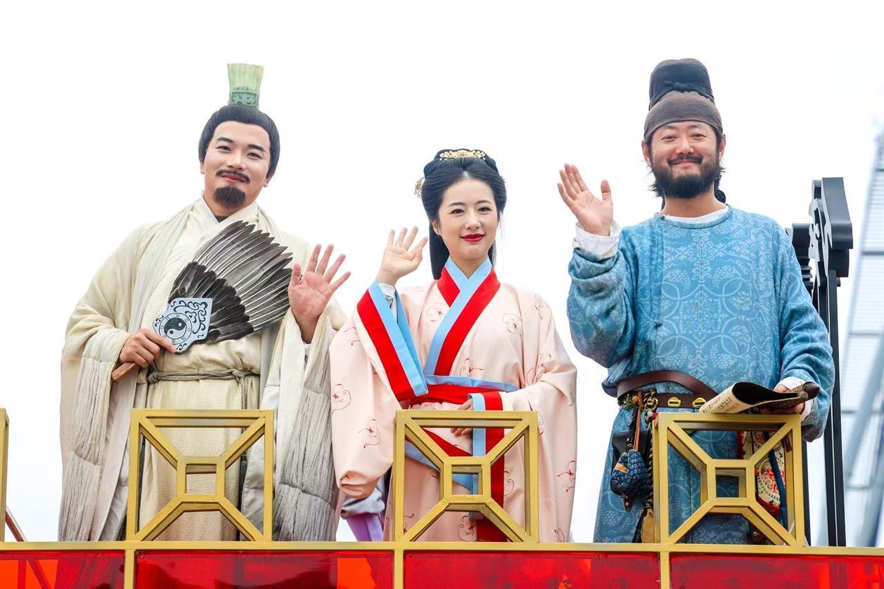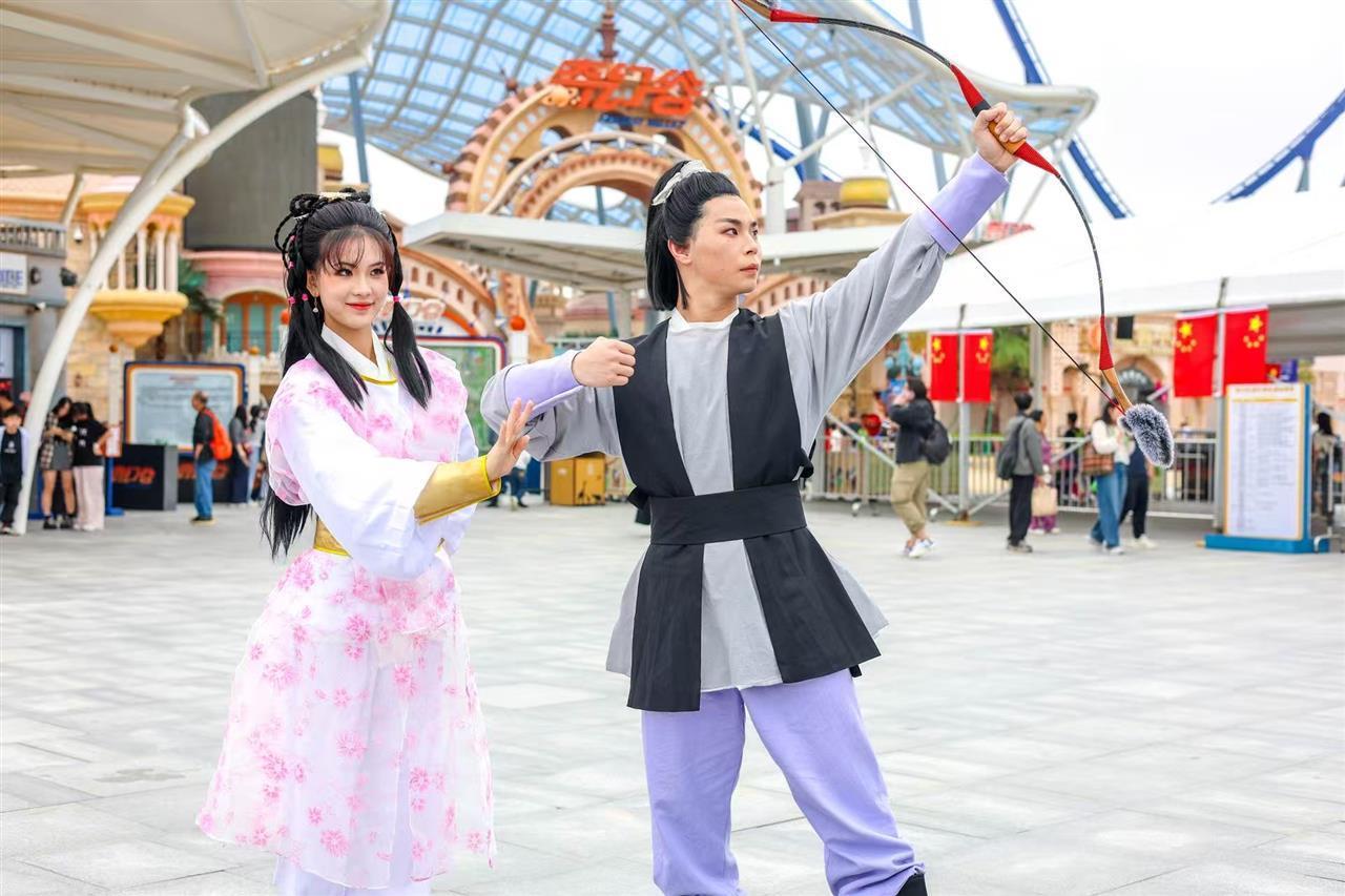 現場更是掀起一陣陣“俠義風暴”:襄陽F4組合帶來蕩氣回腸的古風表演,華僑城“超級小飛俠”驚喜現身,與孩子們歡樂互動,唐城NPC們身著古裝穿行于人群之間,與花車、演員共同編織出一幅流動的武俠畫卷。花車、演員、游客、演出——在此刻交融,營造出沉浸感十足的江湖場景,讓人仿佛一步踏入金庸筆下的快意恩仇之中。