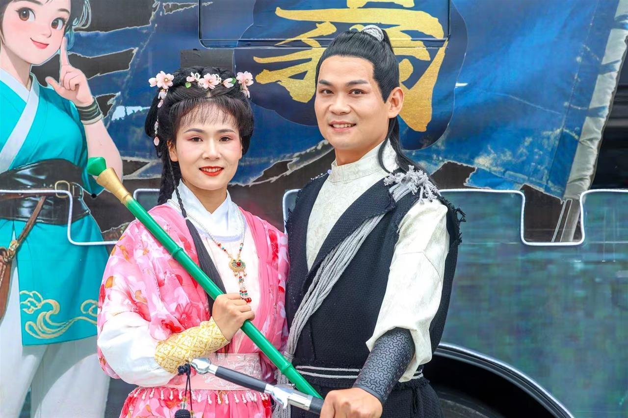 為了讓“俠義精神”從視覺符號轉化為可感可觸的情感體驗,襄陽市文旅局特邀在武漢巡游中亮相的郭靖、黃蓉扮演者親臨現場,與公交版郭靖黃蓉驚喜同臺:花車之上,古裝“靖蓉”憑欄遠眺,目光堅定,仿佛仍在守護這座千年古城;公交車旁,另一組“靖蓉”則復刻83版劇中經典動作,兩組角色遙相呼應,將文學中的俠義場景真實再現于眼前。