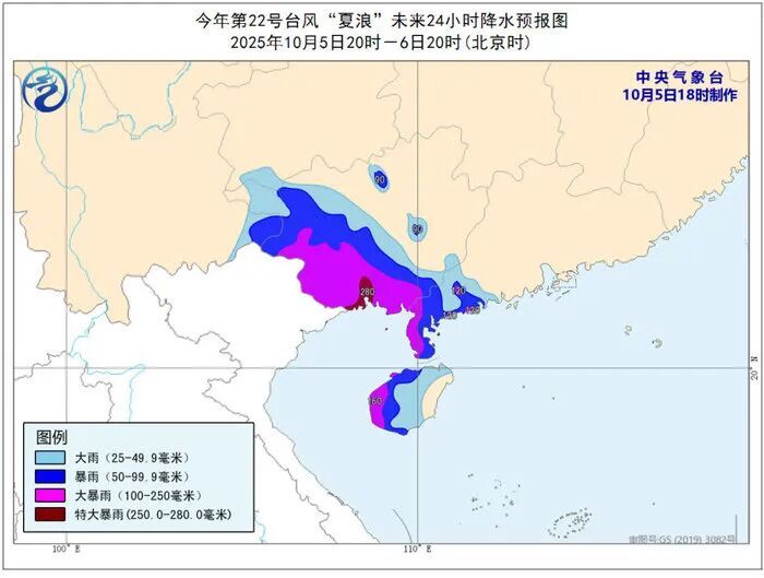 10月5日20時至6日20時,海南島中西部、廣東西南部、廣西南部和西部等地部分地區有暴雨到大暴雨,局地特大暴雨(250-280毫米)。