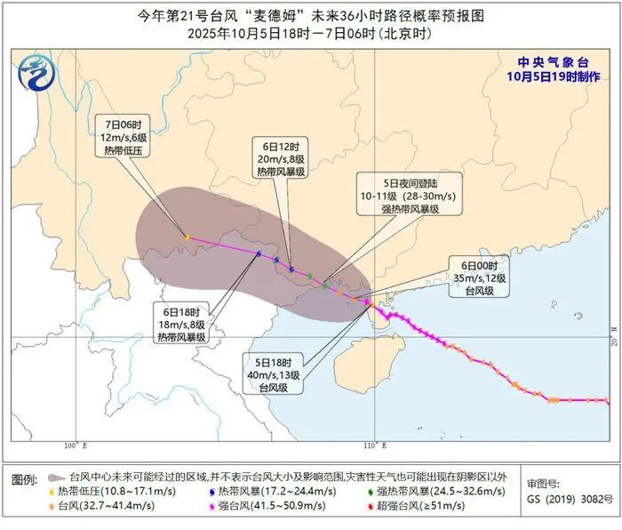 10月5日20時至6日20時,南海西北部、北部灣、瓊州海峽、廣西南部及沿海、廣東西南部及沿海、海南島沿海將有6-8級、陣風9-10級的大風,其中,臺風中心經過的附近海域或地區風力有9-11級、陣風12-13級。