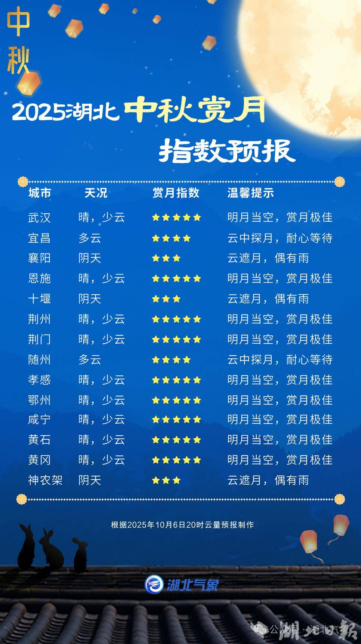 臨近中秋,天公作美,一輪備受矚目的“超級(jí)月亮”將點(diǎn)亮夜空。預(yù)計(jì)中秋之夜(10月6日夜間),鄂東南、鄂東北、江漢平原、鄂西南西部等地天氣晴朗,能見度高,天氣利于賞月;宜昌、隨州兩地以多云為主,需耐心等待月亮探云而出;鄂西北一帶云量較多,部分地區(qū)有陣性降水,對(duì)賞月有一定影響。由于晝夜溫差拉大,公眾應(yīng)留意氣溫變化,及時(shí)調(diào)整著裝,建議采取“洋蔥式”穿衣法。夜間鄂西北以及高海拔地區(qū)較為寒涼,氣溫在20℃以下,戶外活動(dòng)請(qǐng)注意適時(shí)增添衣物,以防感冒。山區(qū)夜間外出賞月還需注意腳下安全。