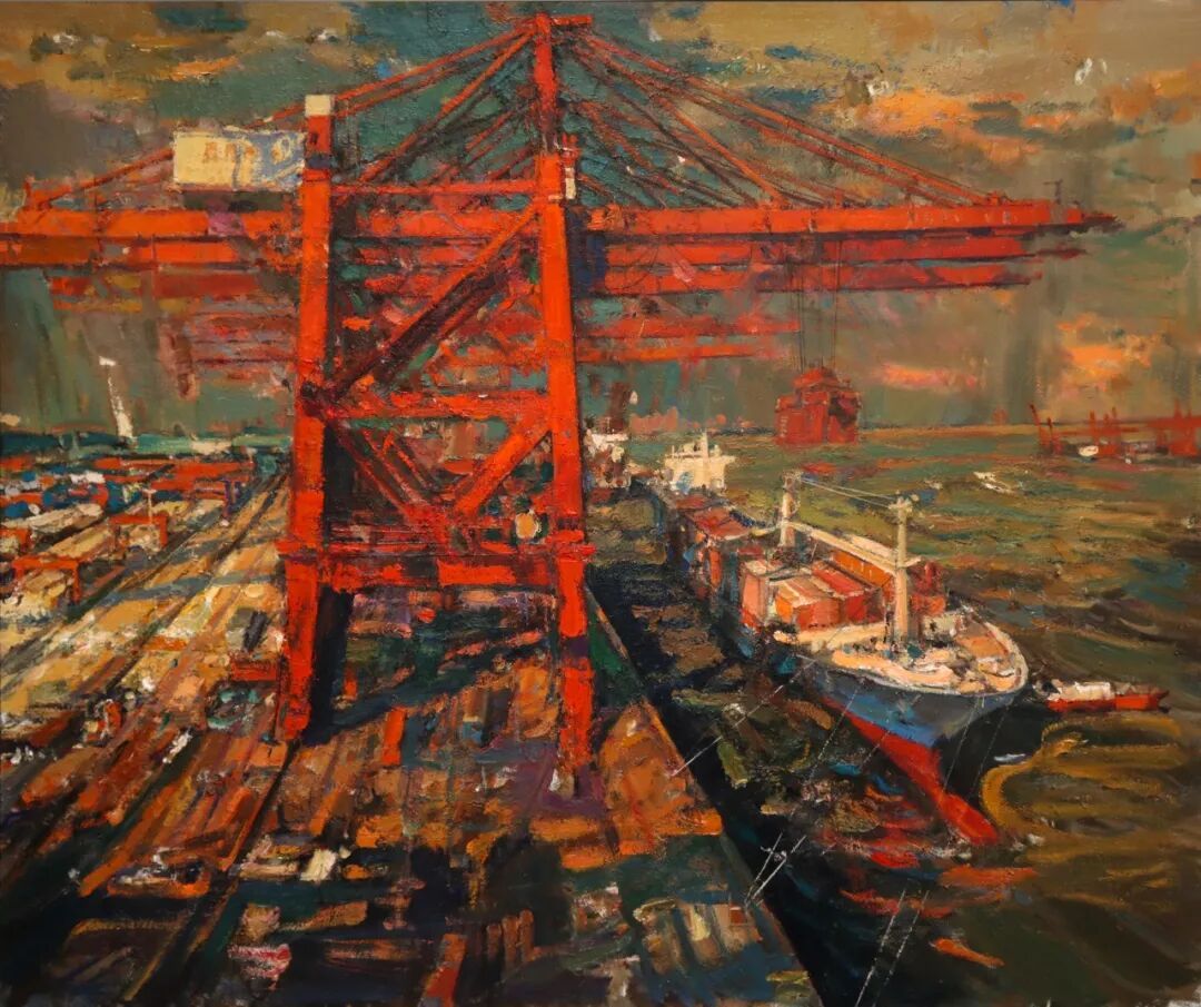 油畫《揚帆起航——海絲起點之廈門港碼頭》,作者劉玉龍。東海之濱,海絲古港——廈門港正全力轉型升級,不斷續寫傳奇。作品擷取港口碼頭一景,以厚重的筆觸刻畫了林立的起重機和穿梭的船只等,折射出21世紀海上絲綢之路重要節點的繁忙景象與磅礴氣象。