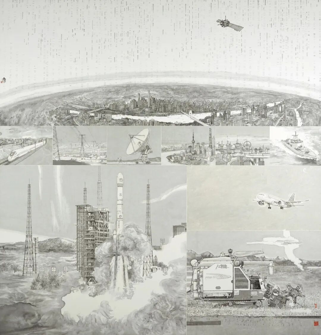 中國畫《國之重器·北斗》,作者宋德志。作者通過精心重組主題元素,使海陸空景象巧妙交織,呈現了北斗在能源交通、農業生產、城市建設等領域的廣泛運用,生動詮釋北斗應用不斷深度融入國民經濟發展全局。素雅的筆墨處理賦予畫面輕靈之美,意在表達北斗衛星導航系統那種看不見的支撐力量。