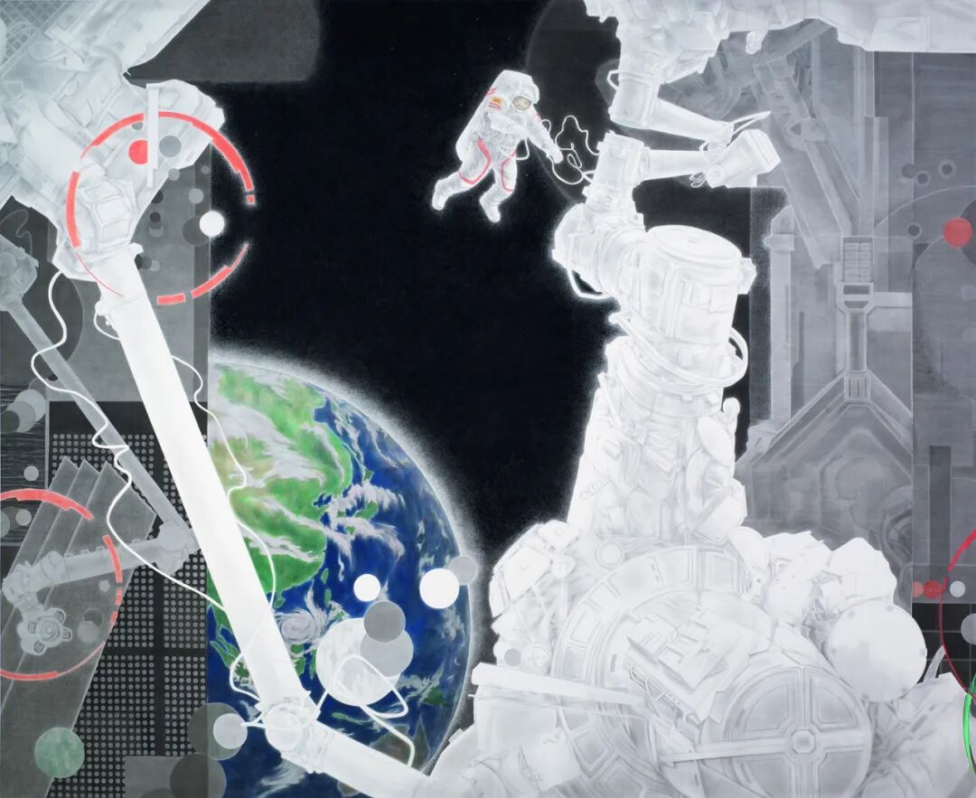 中國畫《出艙》,作者楊斌。“十四五”以來,我國載人航天技術向著更高層次不斷跨越。作品描繪了翟志剛、王亞平、葉光富3名航天員,在神舟十三號載人飛船與空間站組合體完成自主快速交會對接后,乘組執行第一次出艙活動的場景。作者以墨色的濃淡渲染以及物象的幾何形態構成,營造出科技美感和濃濃詩意;黑白的強烈對比進一步凸顯宇宙的浩渺深邃,為讀者留下無限想象空間。