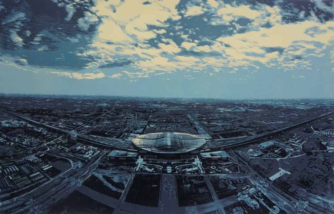 版畫《雄安的黎明》,作者王芳。從“一塊地”到“一張圖”再到“一座城”,八載光陰,河北雄安新區拔節生長、日新月異。作品以俯瞰式構圖,展開一幅壯闊圖景。畫面上,寫實的雄安站巍然屹立,位于視覺中心;四通八達的路網和各功能區交織,配以沉穩的色彩和光線的巧妙運用,彰顯這座城市璀璨的未來。
