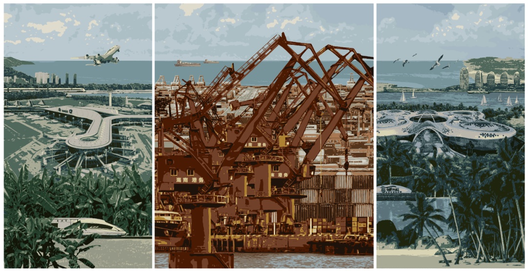 版畫《海南自貿港》,作者孔國橋、魯利鋒、王克景。南海之濱,改革潮涌。5年來,海南自貿港加速建設發展,步入成形起勢新階段。作品以絕版套色木刻和三聯畫形式,刻畫了自貿港宏闊的場景,通過冷暖色彩的運用著意突出機場、港口、基建等主體,在跨時空描繪中多角度展現海南自貿港繁榮的景象和蓬勃的活力,奏響開放發展的時代樂章。