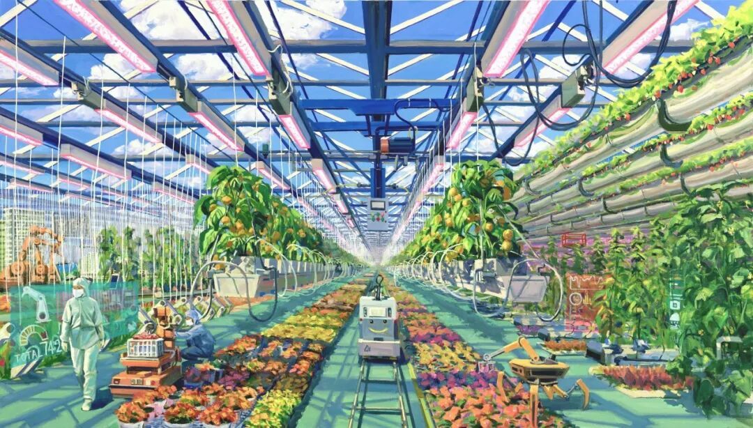 油畫《智能農業園》,作者袁元、張子欣。在科技驅動下,智慧農業發展邁上新臺階。作品聚焦智能溫室農業生產場景,重在表現物聯網監控系統等對傳統農業的改造。畫面以寫實的筆觸、開闊的構圖和明亮的色彩,營造出滿滿的科技感;現代設施的幾何化結構與農作物的自然曲線相映成趣,工業美學與田園詩意融為一體,鋪展田園牧歌新畫卷。