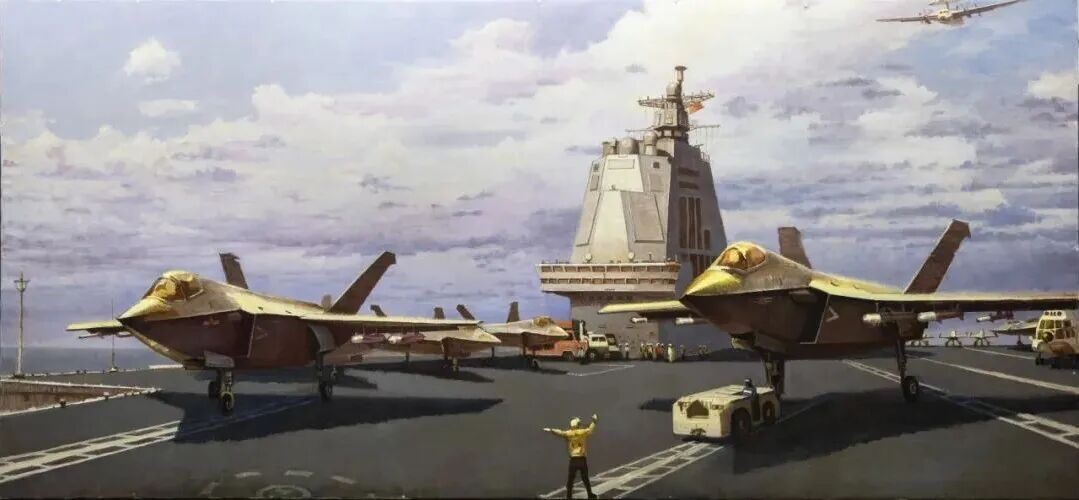 油畫《箭上弦》,作者周補田。福建艦作為我國首艘采用電磁彈射技術的航母,標志著海軍裝備科技邁入全新階段。殲—35作為新一代艦載戰斗機,從列裝到亮相九三閱兵,成為我國國防實力的生動注腳。通過畫筆,“科技強軍”的抽象概念轉化為具象畫面,并且不再是傳統軍事題材中單一的武器展示,而是聚焦殲—35在福建艦上“準備彈射”這一動態瞬間——如箭在弦,使命必達。