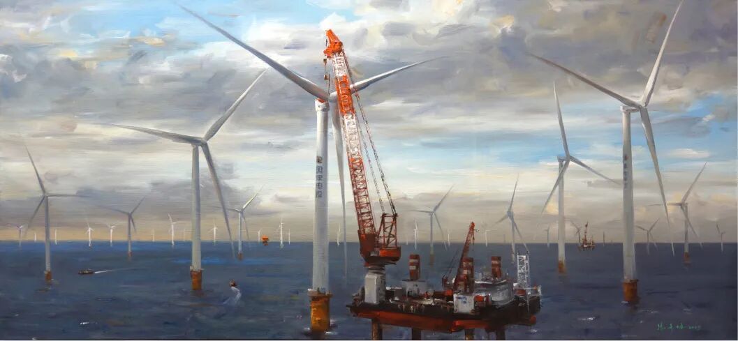 油畫《惠來——海上風電》,作者馮少協。“海上風電走廊”點亮萬億綠能、海洋牧場智慧養殖平臺矗立海面……“海上新廣東”美麗畫卷正徐徐鋪展。作者將真實見聞訴諸筆端,以飽滿的激情和開闊的構圖,描繪了碧海藍天間風電機組的宏偉矩陣。作品中,天空與海面構成寧靜卻充滿張力的場域,工業力量與詩意圖景相融,繪就清潔能源發展新篇章。